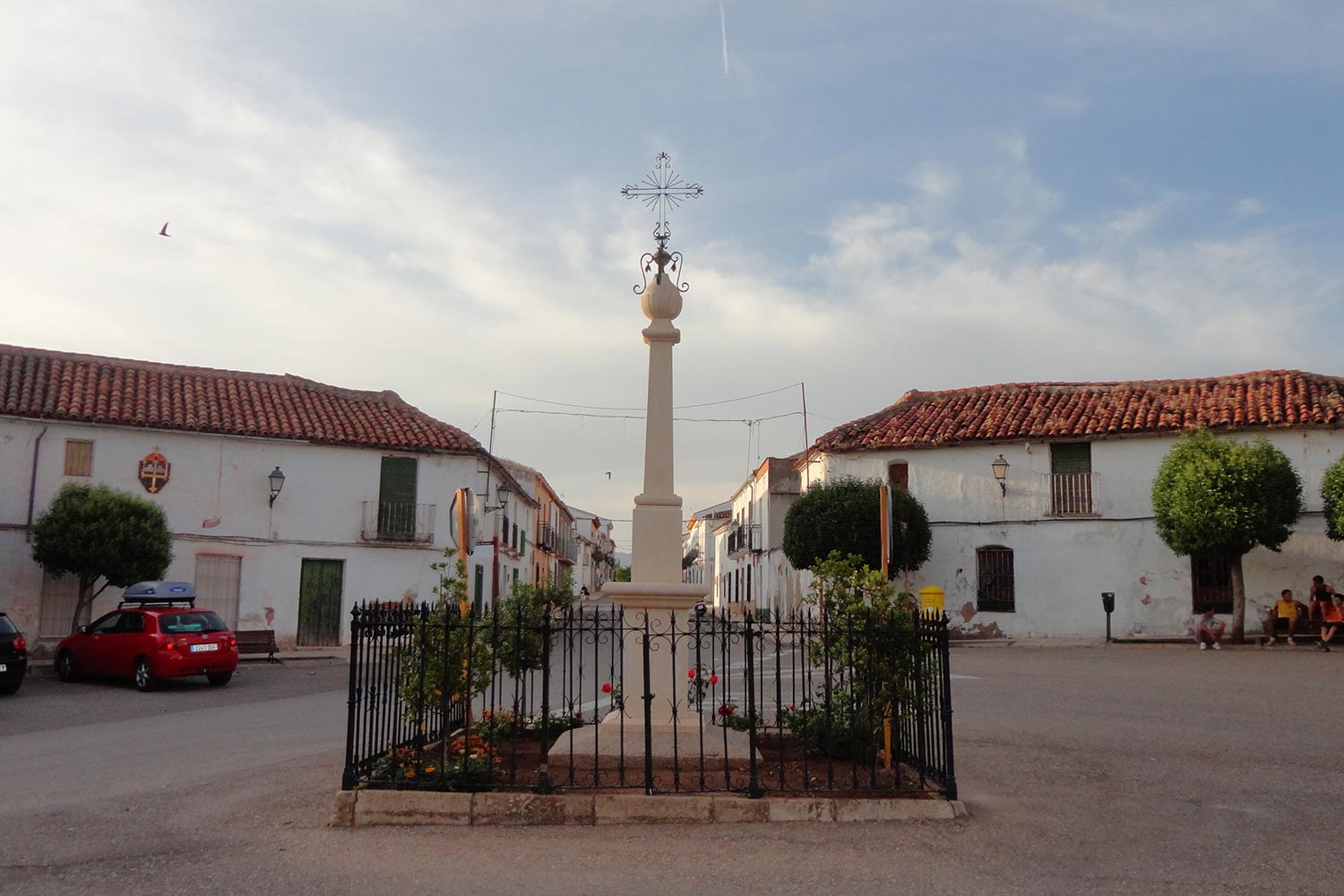 Plaza que ordena la trama urbana de la población. Se configuró para acoger y recibir al viajero en un amplio espacio público presidido por la fachada de la parroquia, a la vez que hace de reparto del viario, pues en este punto se abre a la izquierda el camino hacia Granada y a la derecha se continúa el camino de Andalucía.